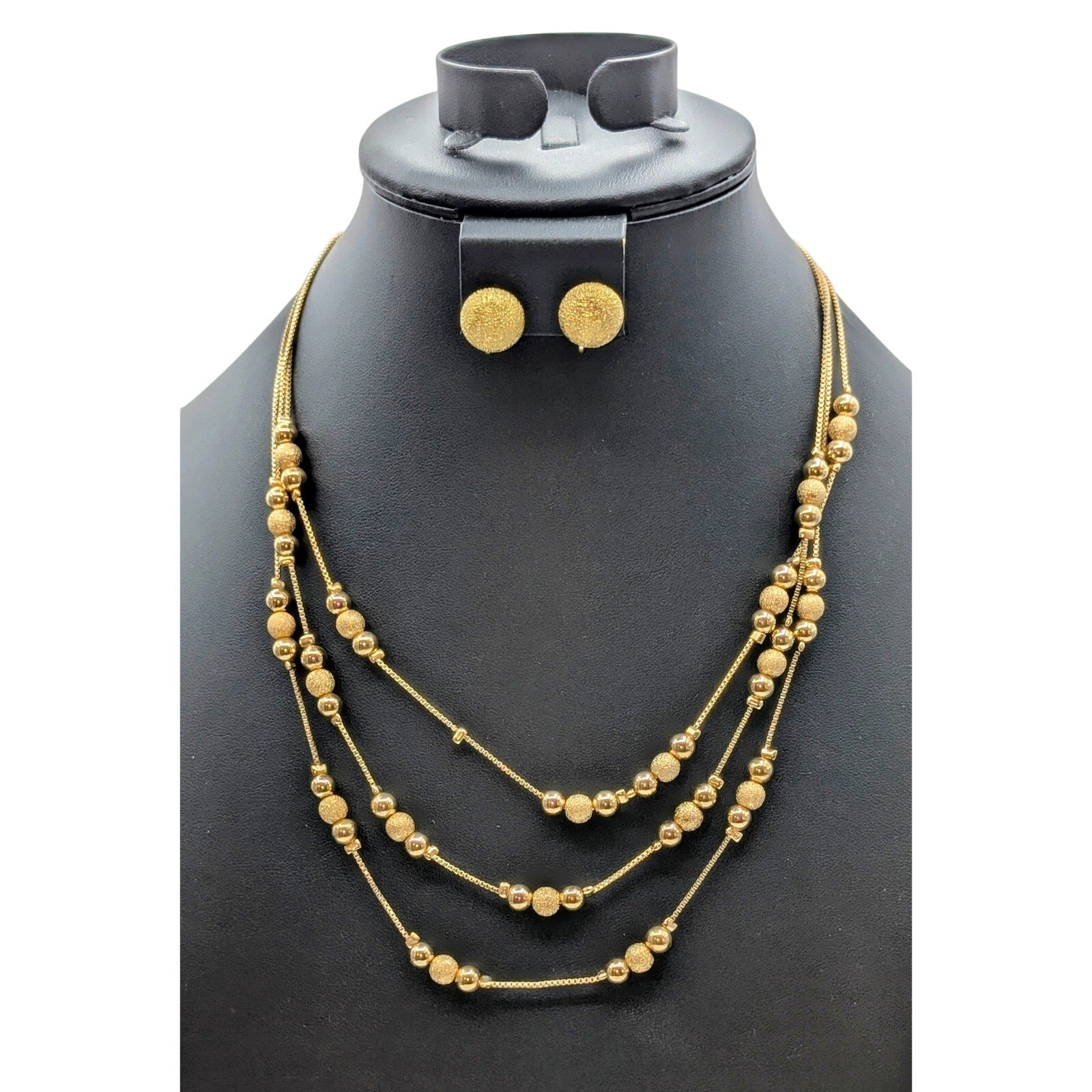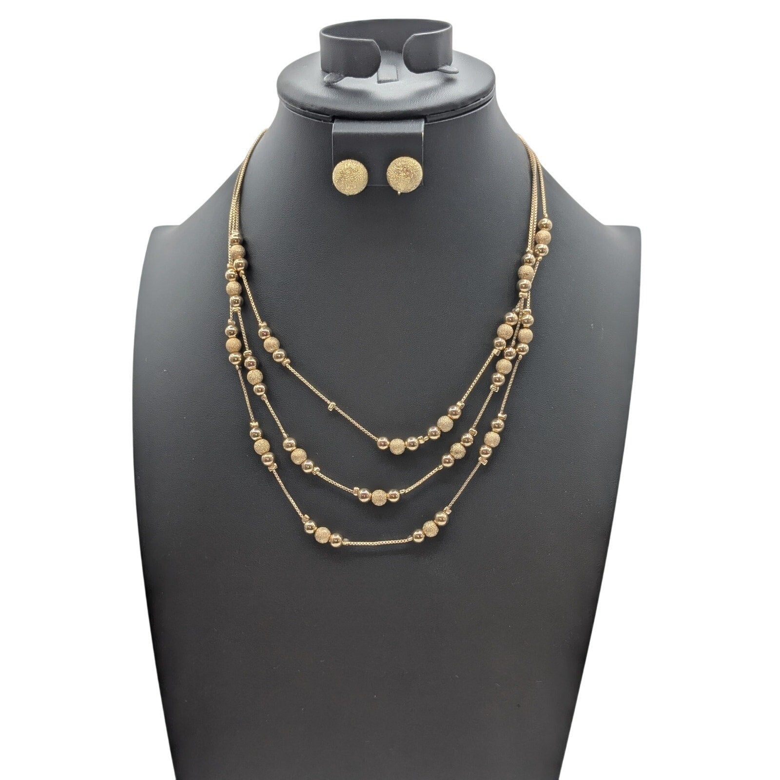 Vtg Etienne Aigner Three Strand Brushed Gold Tone Ball Necklace Earring Set