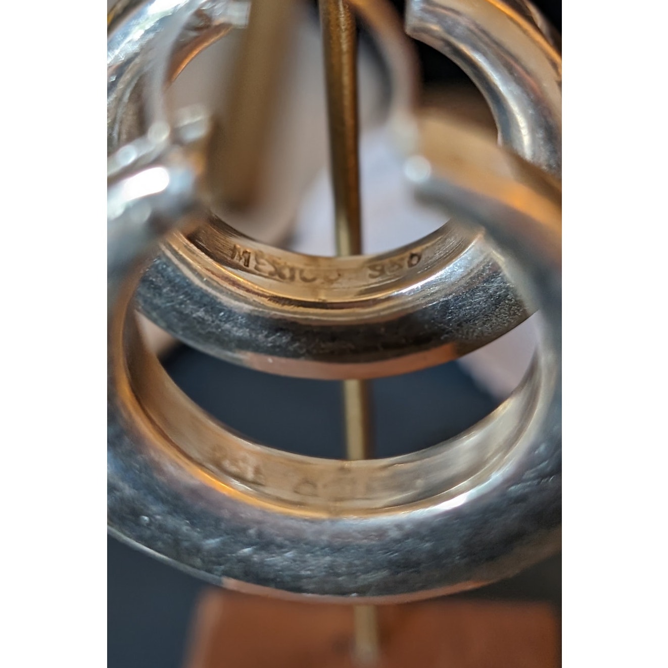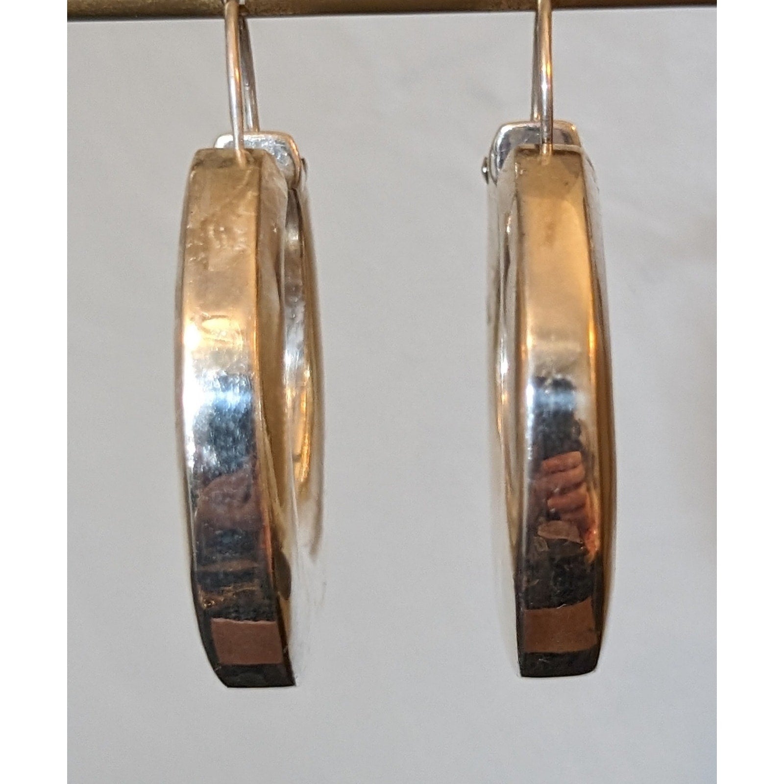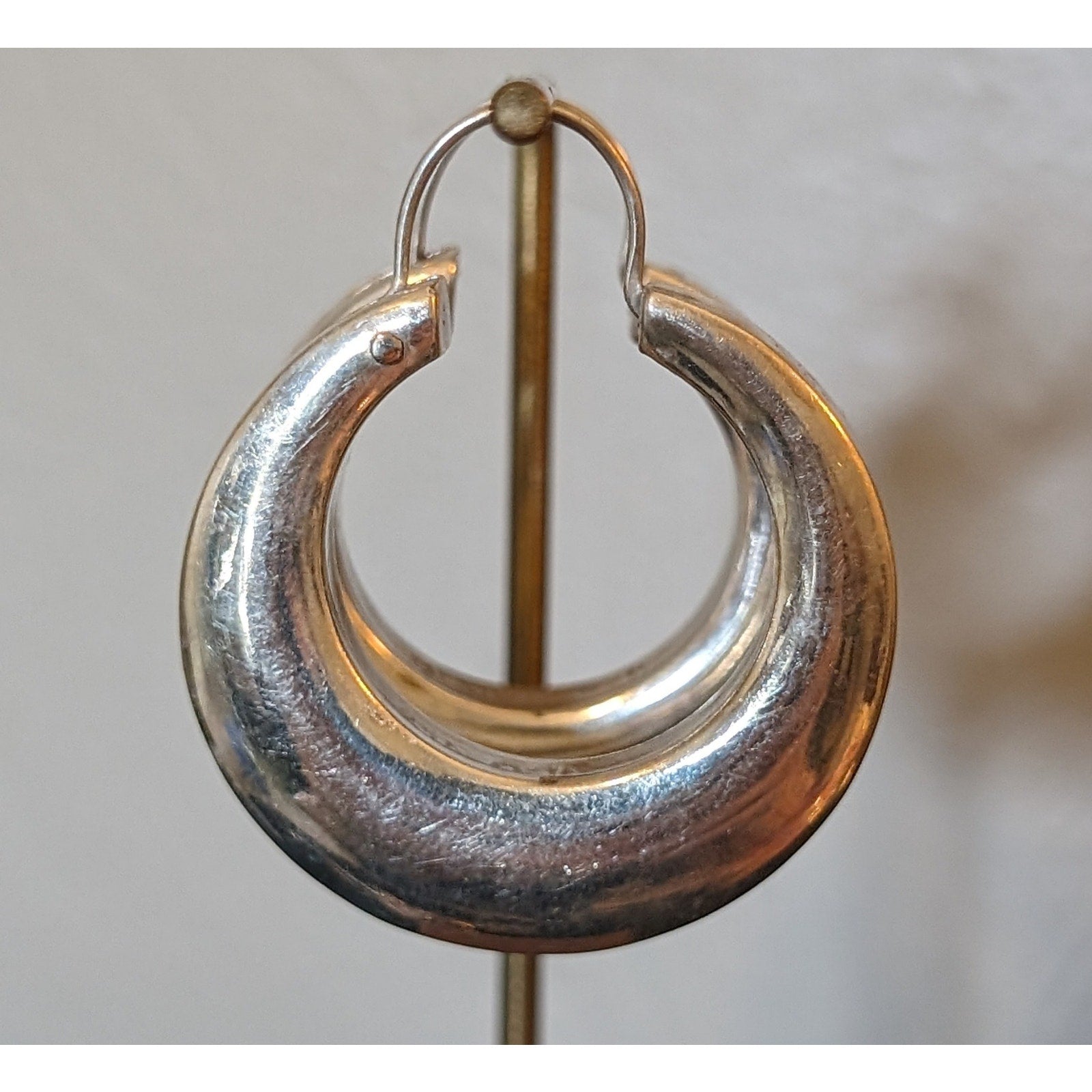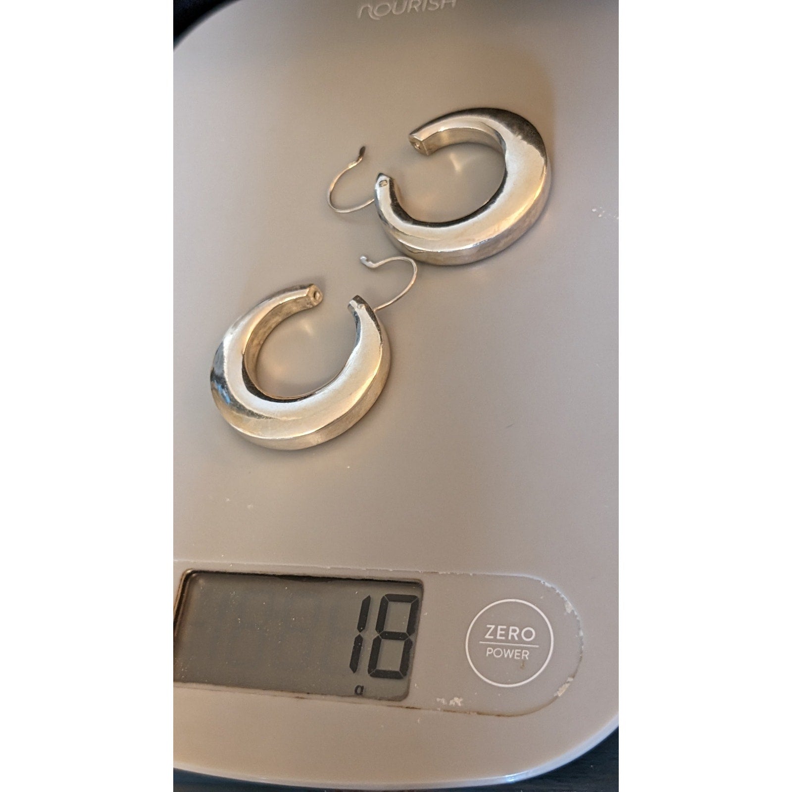 Vtg. Marked Mexico 950 Sterling Silver Basket Hook hick Gypsy Hoop Earrings 18g. Old Mexican 950 silver. These are exquisite craftsmanship. They measure 1.5" in diameter and 1/4" wide at their widest point. On my kitchen scale, they weigh 18 grams and it typically rounds up. They will come with a polishing cloth. They are sturdy and made to last a lifetime. The more I polish them, the shinier they get. Pre-owned, these are in excellent condition. I thought they might be hard to put on by myself, but they really aren't. And that latch really holds them secure. Any question, feel free to ask. Chunky, gypsy, vintage or older.