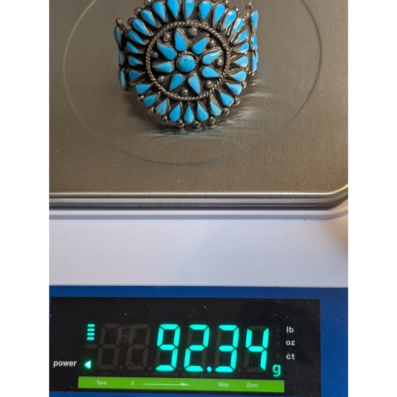 VTG Native ZUNI Sterling Silver Teardrop & Round TURQUOISE Flower Blossom Cuff Bracelet 92.34g. This piece is from the estate of a lady who lived in Oklahoma and was sole owner. She had leather inserts made for each piece of her collection of cuff bracelets that are easy to remove or place for storage or wear. There may be a mark on the inside or it is just part of the silver, I can't be certain. The main turquoise cluster contains 35 stones and measures 2 3/4" x 2 3/4". The semi-circle side pieces each contain 8 stones, for a total of 51 natural turquoise stones. It is 5 1/2" with a 1" opening and weighs 92.34g. This vintage piece is a must have for the serious collector! Excellent condition.