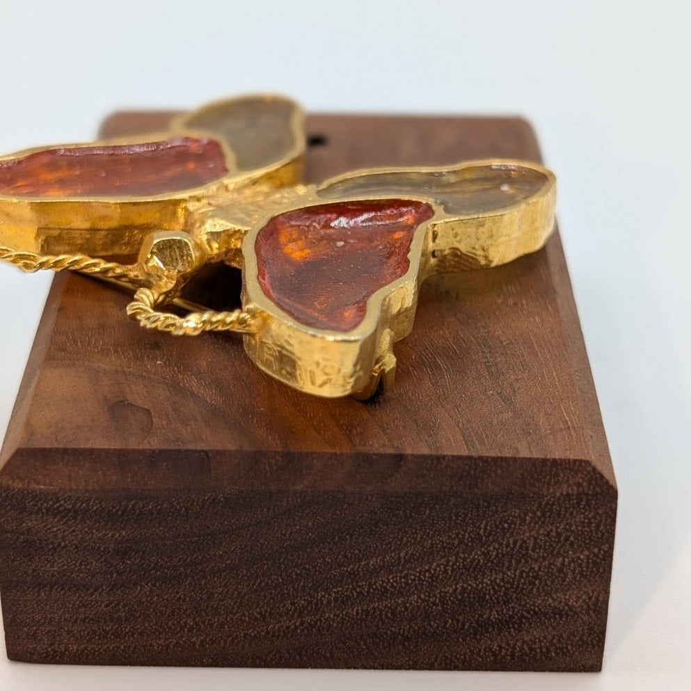 VTG Signed Mr. WE Stained Glass Resin Orange Yellow Gold Tone Butterfly Brooch