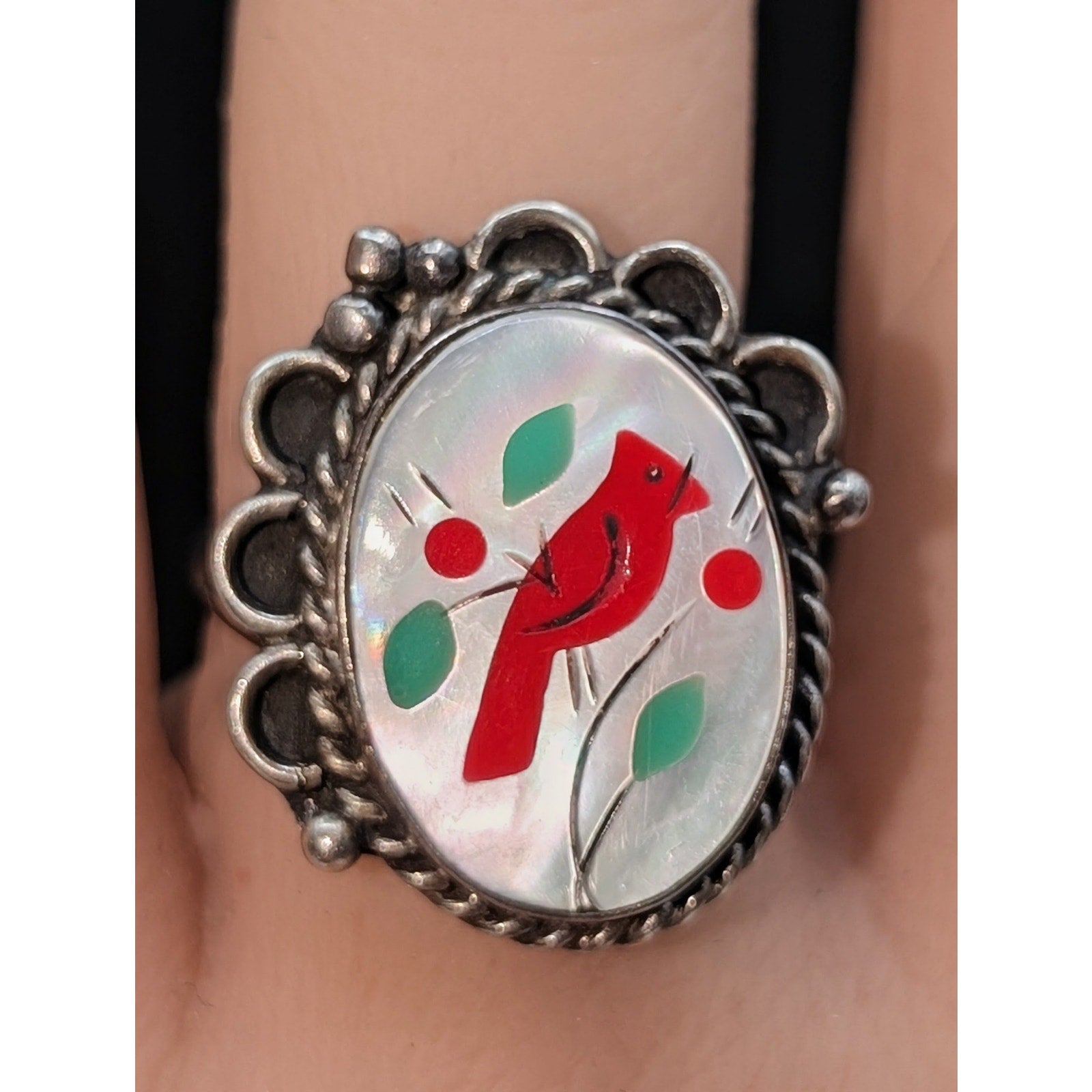 Vtg Southwest Mother of Pearl Inlay Cardinal 925 Sterling Silver Ring Size 6.25