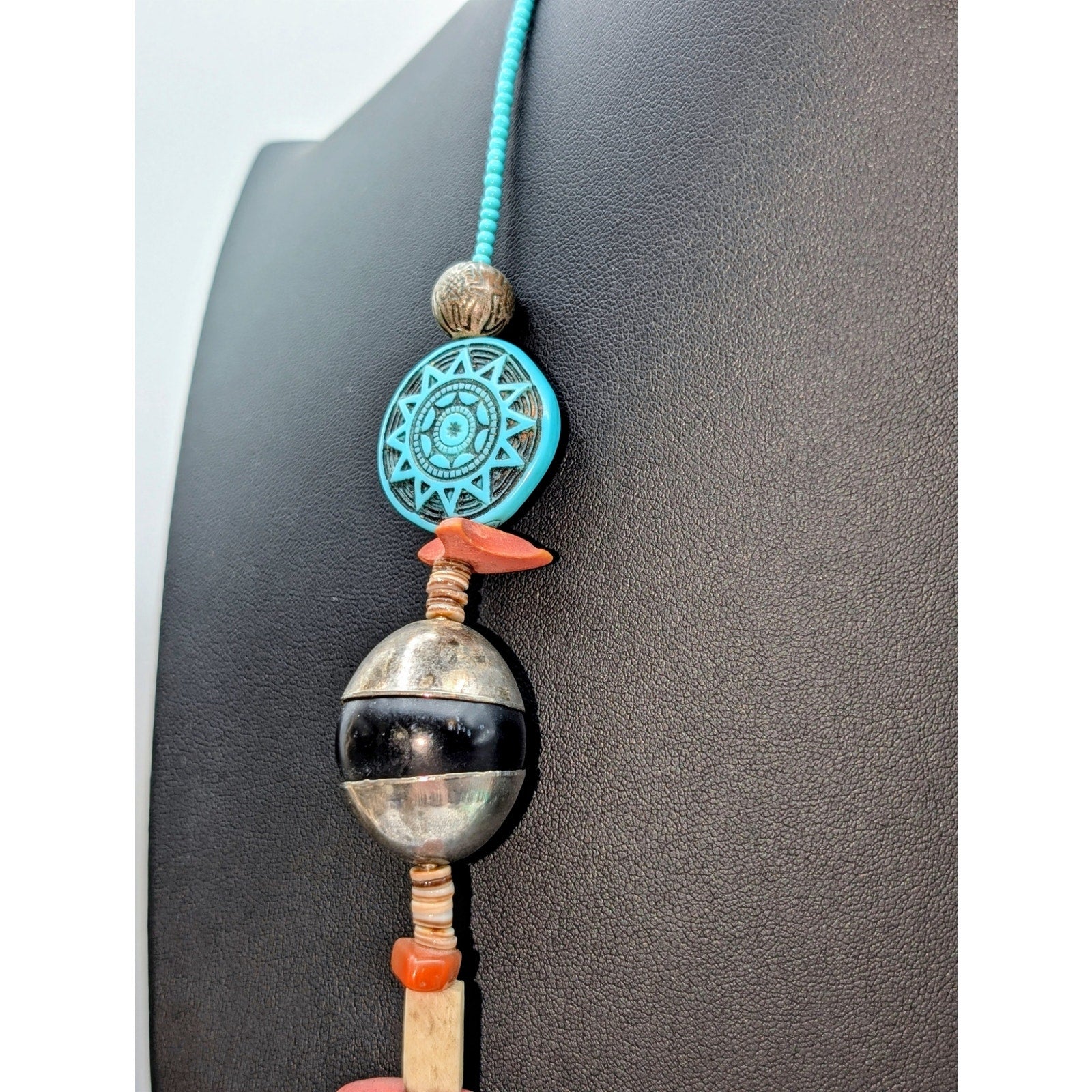 Vtg Southwestern Multi-Shape & Heishi Bead Turquoise Terra Cotta Color 28" Necklace. Resin, metal, stone, and shell beaded necklace with vintage slide in clasp. Pre-owned, this necklace is in excellent condition.