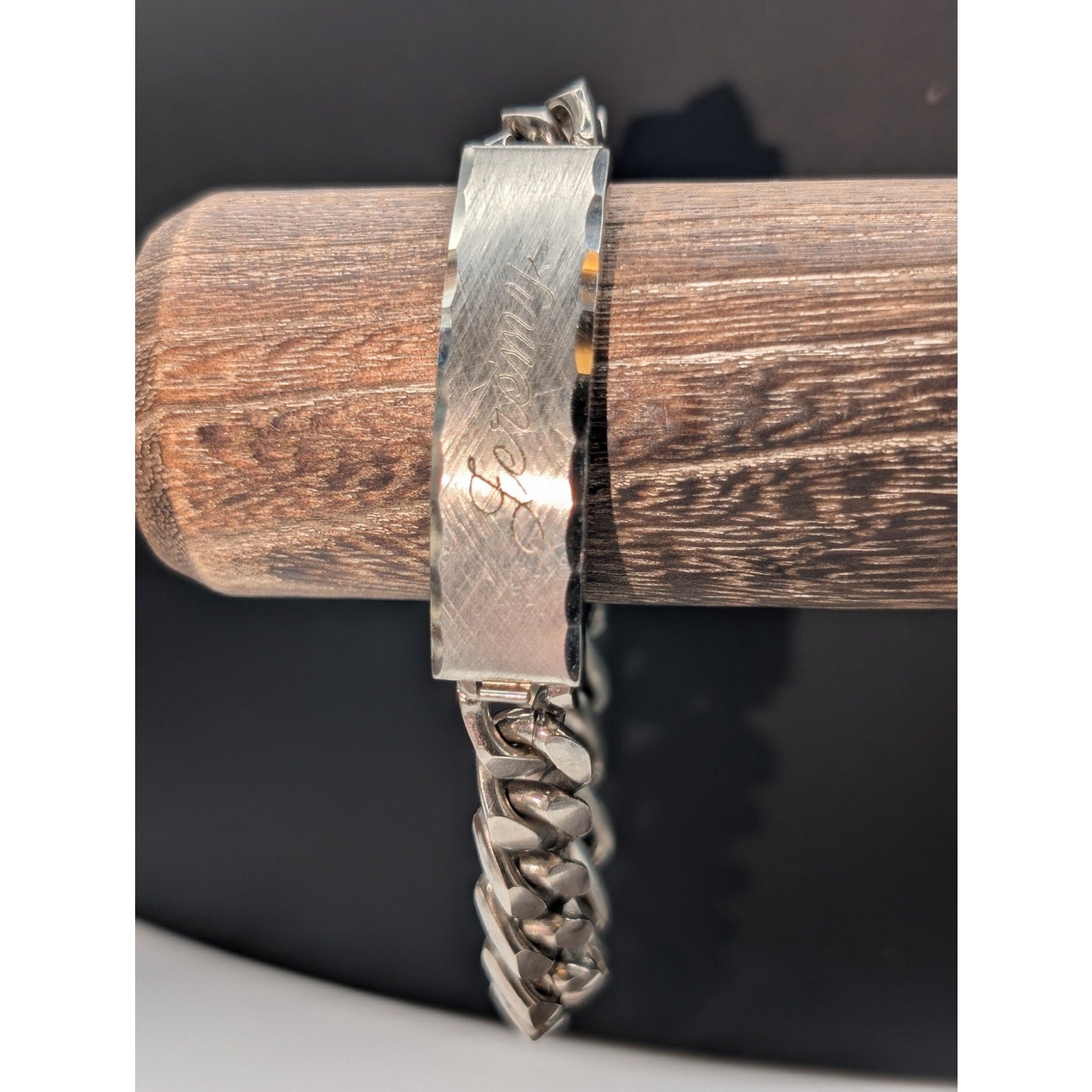 Vtg SPEIDEL USA Mens 'Jeremy' Engraved Silver Tone ID Bracelet Signed STE TA