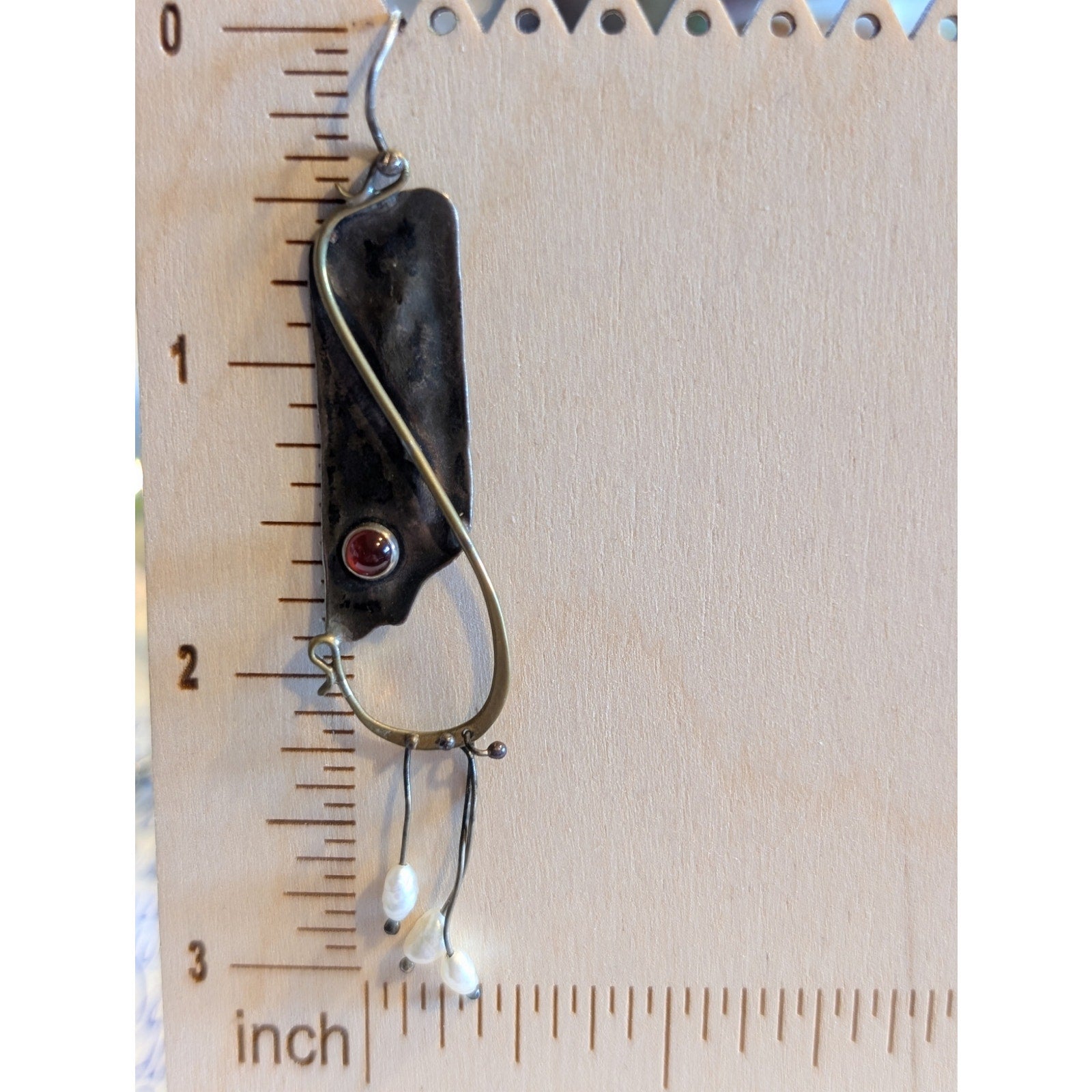 Vtg 1991 Signed by Artist Sterling Brass Carnelian Stone & Freshwater Pearl Dangle Artisan Earrings. Pre-owned, these earrings are in excellent rustic vintage condition. Very unusual. I can make out c.1991 but not sure about the artist. It looks like the initials LB ND possibly.