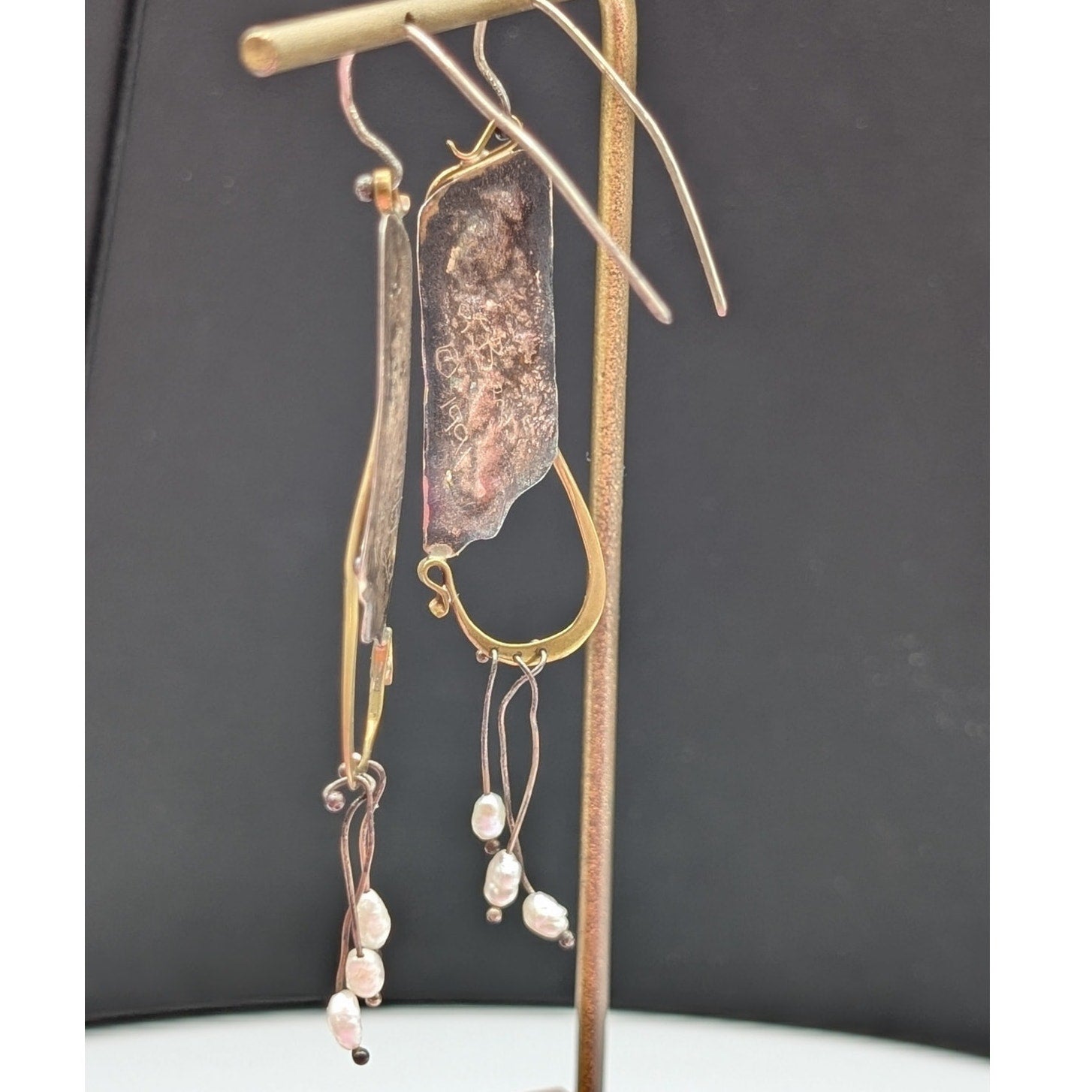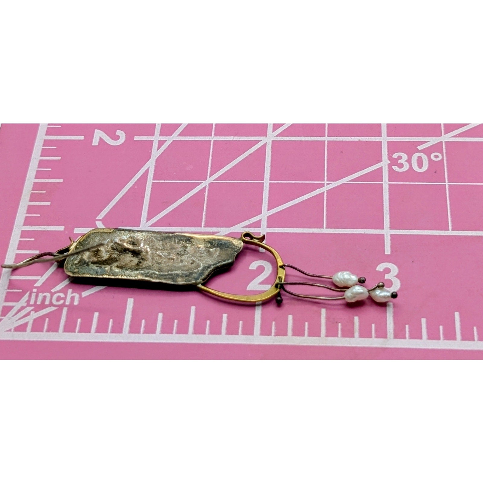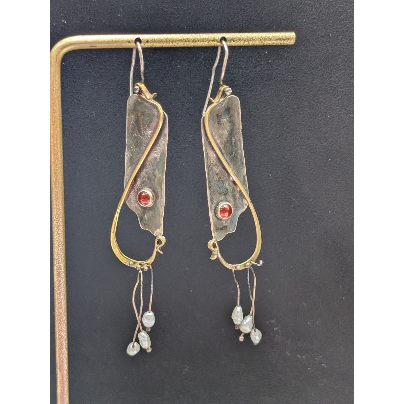 Vtg Sterling Brass Carnelian Stone & Freshwater Pearl Dangle Artisan Earrings
