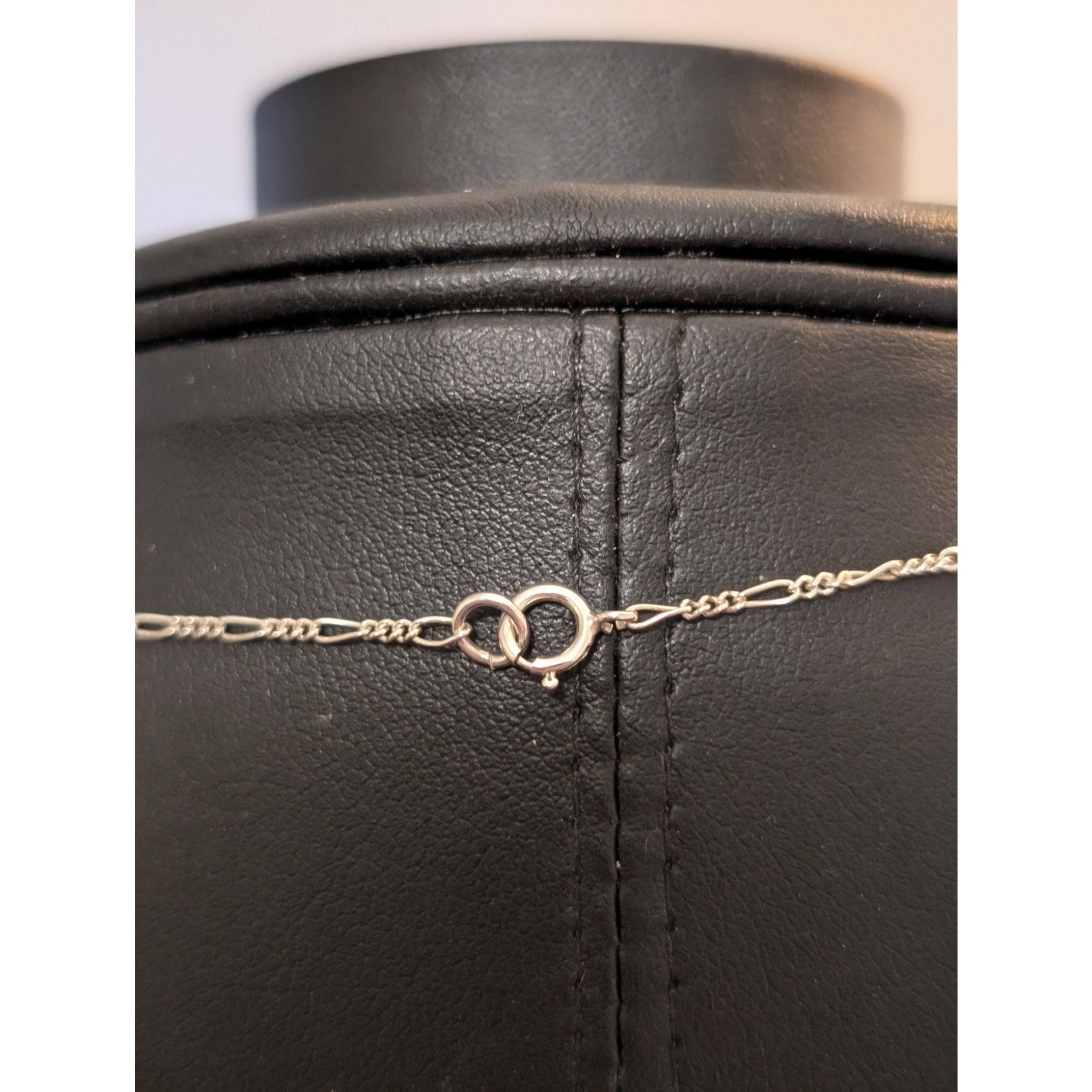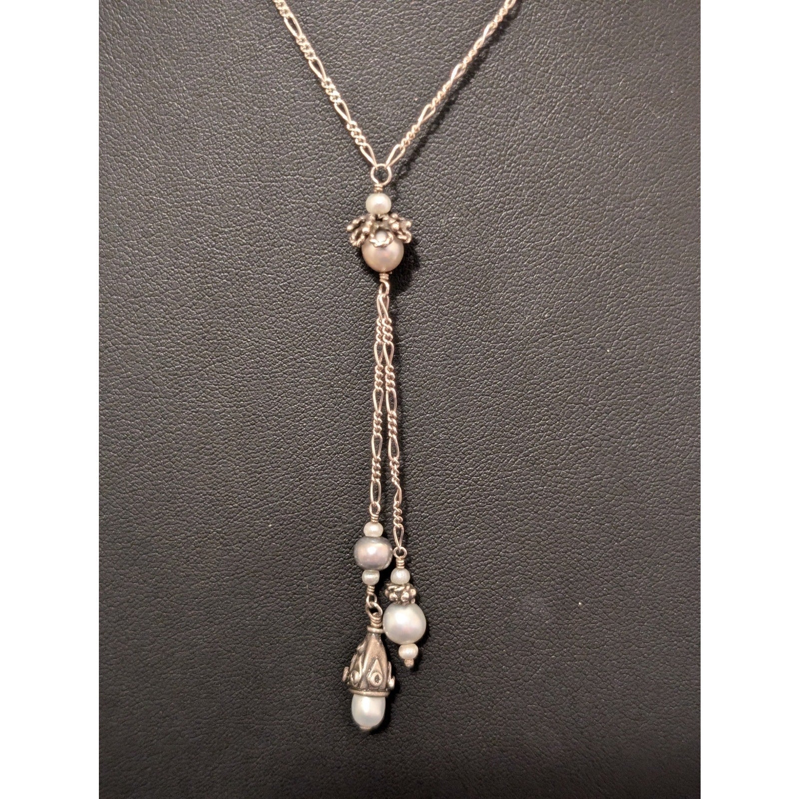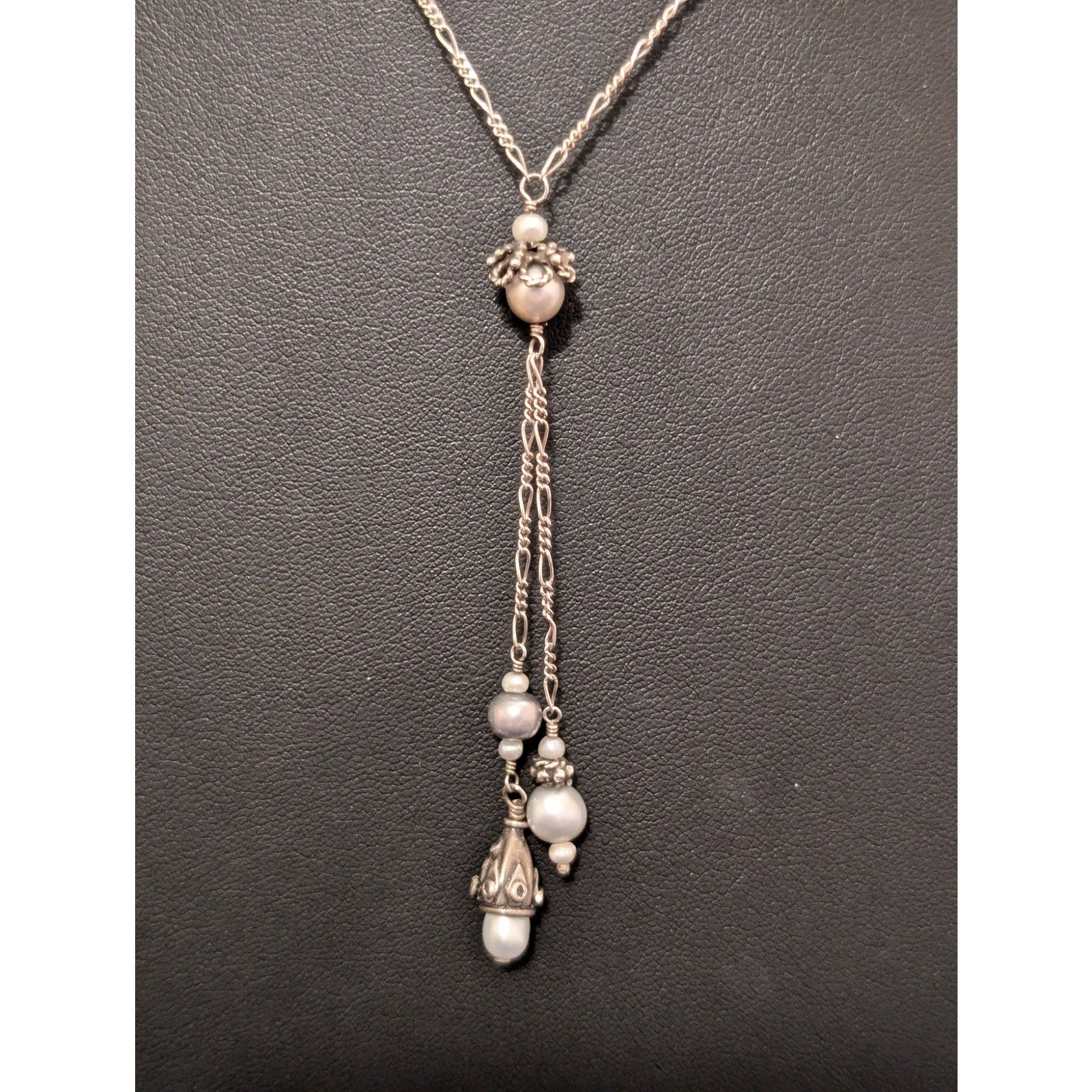 Vtg Sterling Silver Figaro Gray White Multi-Shaped Pearl Crystal Y Necklace. Pre-owned, this necklace is in excellent condition. Gray and white different shaped pearls are suspended by a dainty sterling figaro chain. Sterling textured and crystal beads. Beautiful vintage piece. Measures 17" around the neck.