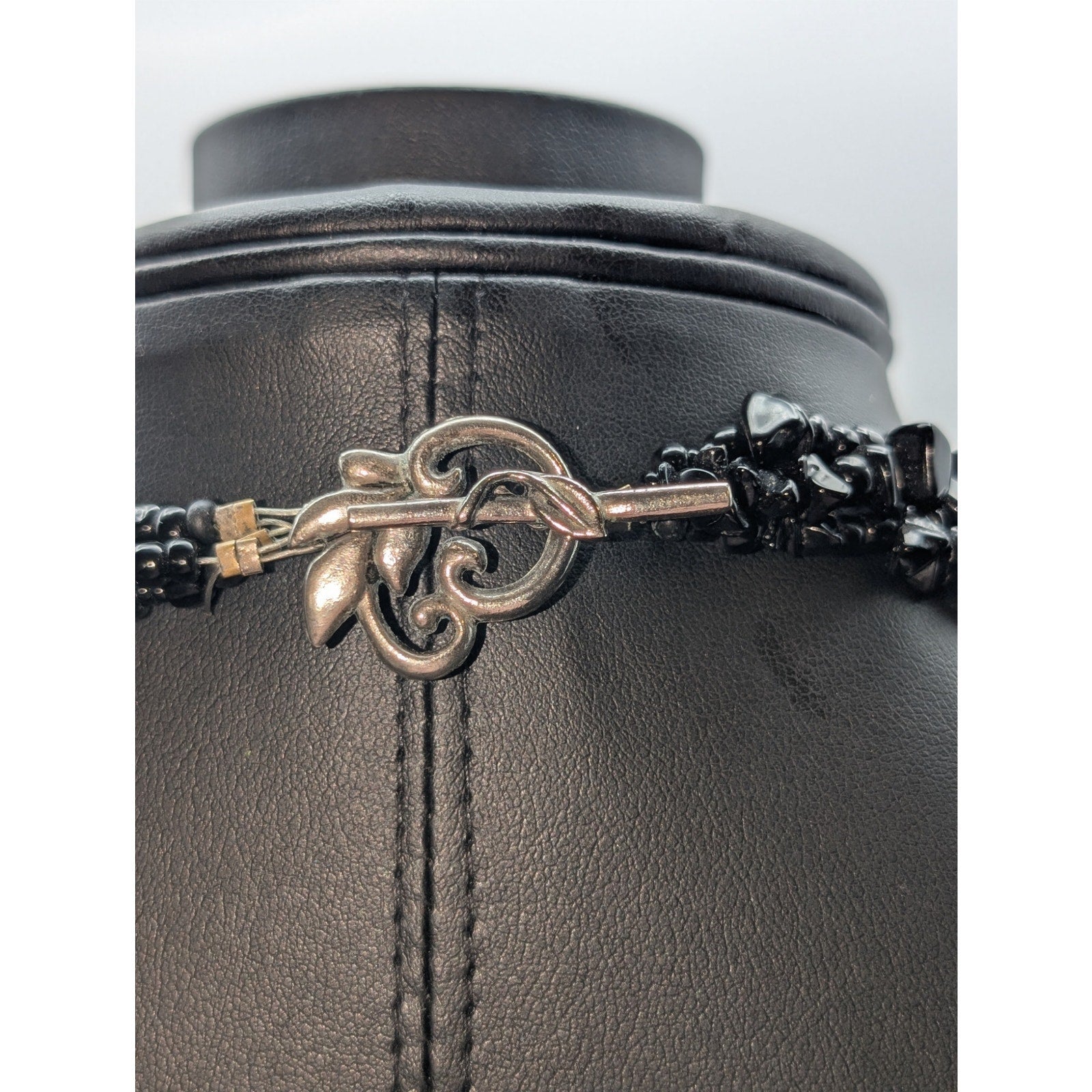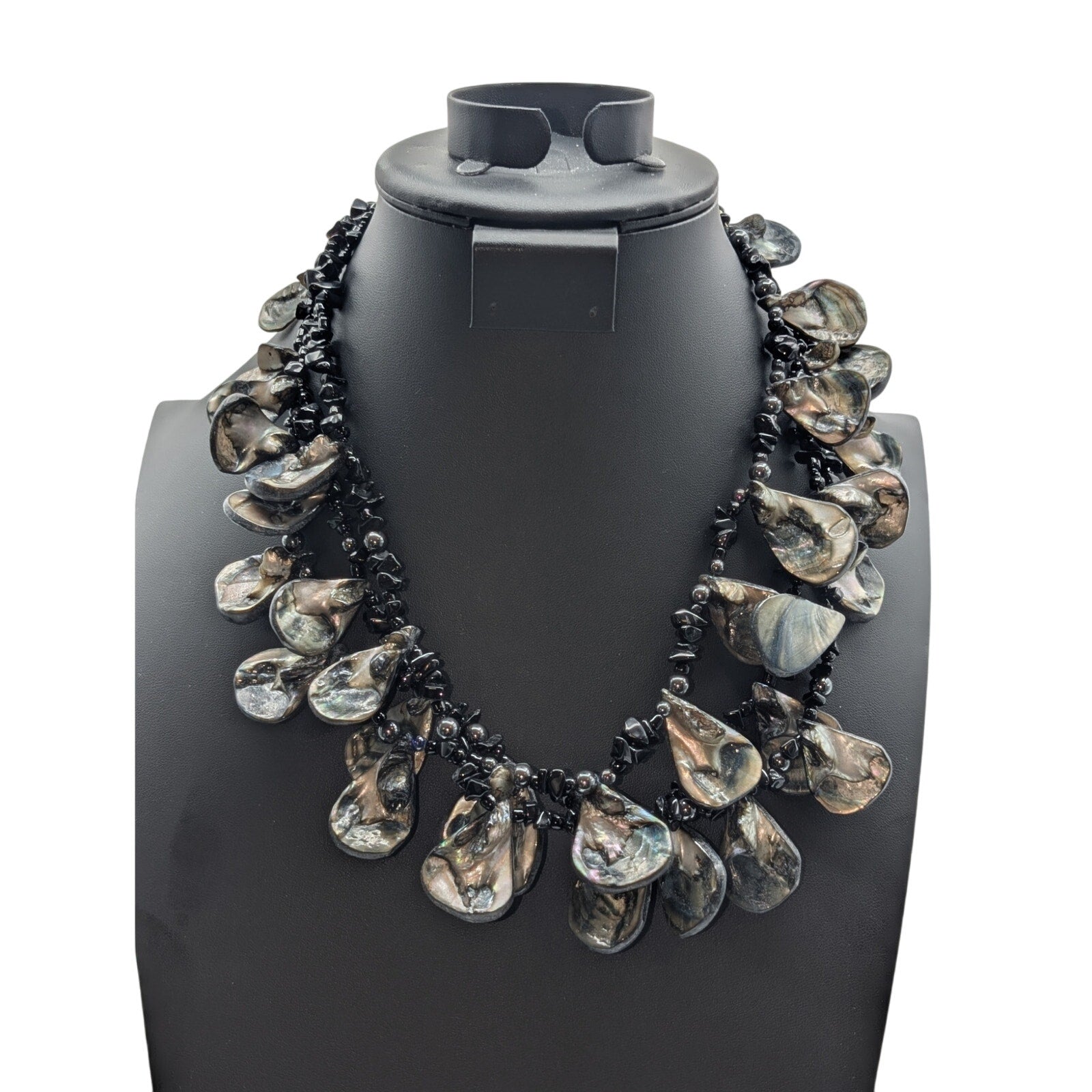 Vintage Three Strand Shell Teardrop Dangle Black Onyx Chip & Glass Bead 20" Silver Tone Fancy Toggle Clasp Necklace. Pre-owned, this necklace is in excellent condition. This is a beautiful statement piece. A LBD is all you need.