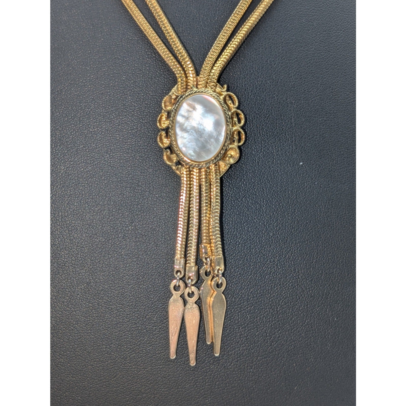 Vtg Yellow Gold Plated Double Snake Chain MOP Glass Tassel 17"-20.5" Necklace. Pre-owned, this lovely necklace is in excellent vintage condition. Hook clasp. Bolo style. Really nice vintage piece.