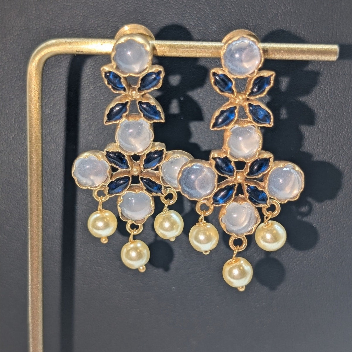 Well Made Gold Tone Non Metallic Blue Glass Pearl Dangle Long Post Earrings