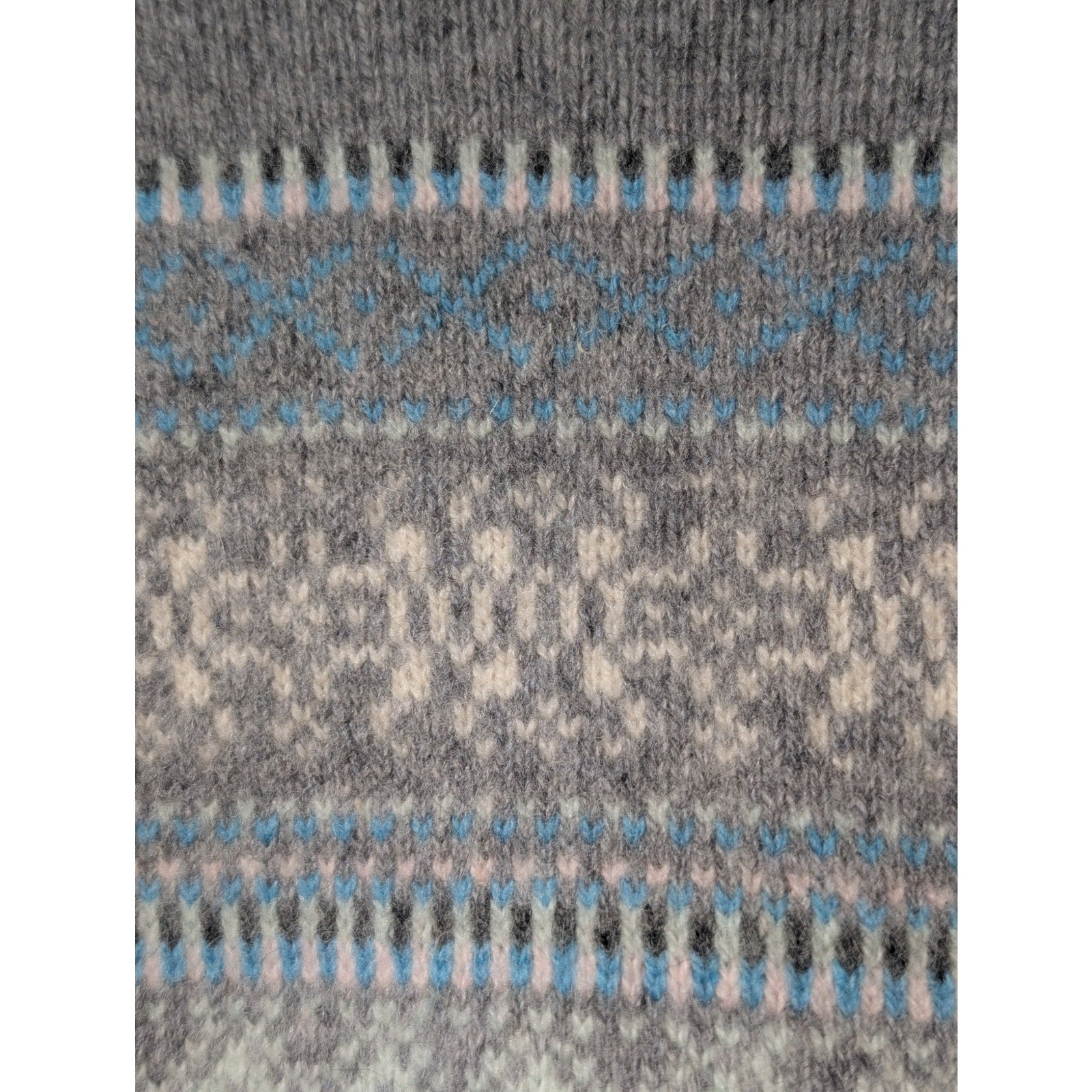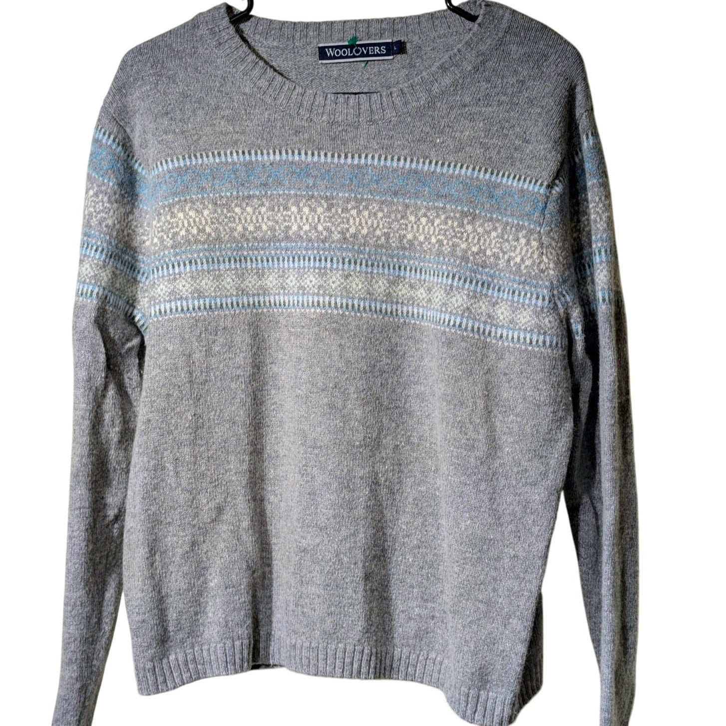 Woolovers Gray Blue Fairisle Crew Neck Pullover Long Sleeve Sweater Size L. Pre-owned, this lovely neutral classic wool sweater is in excellent condition.